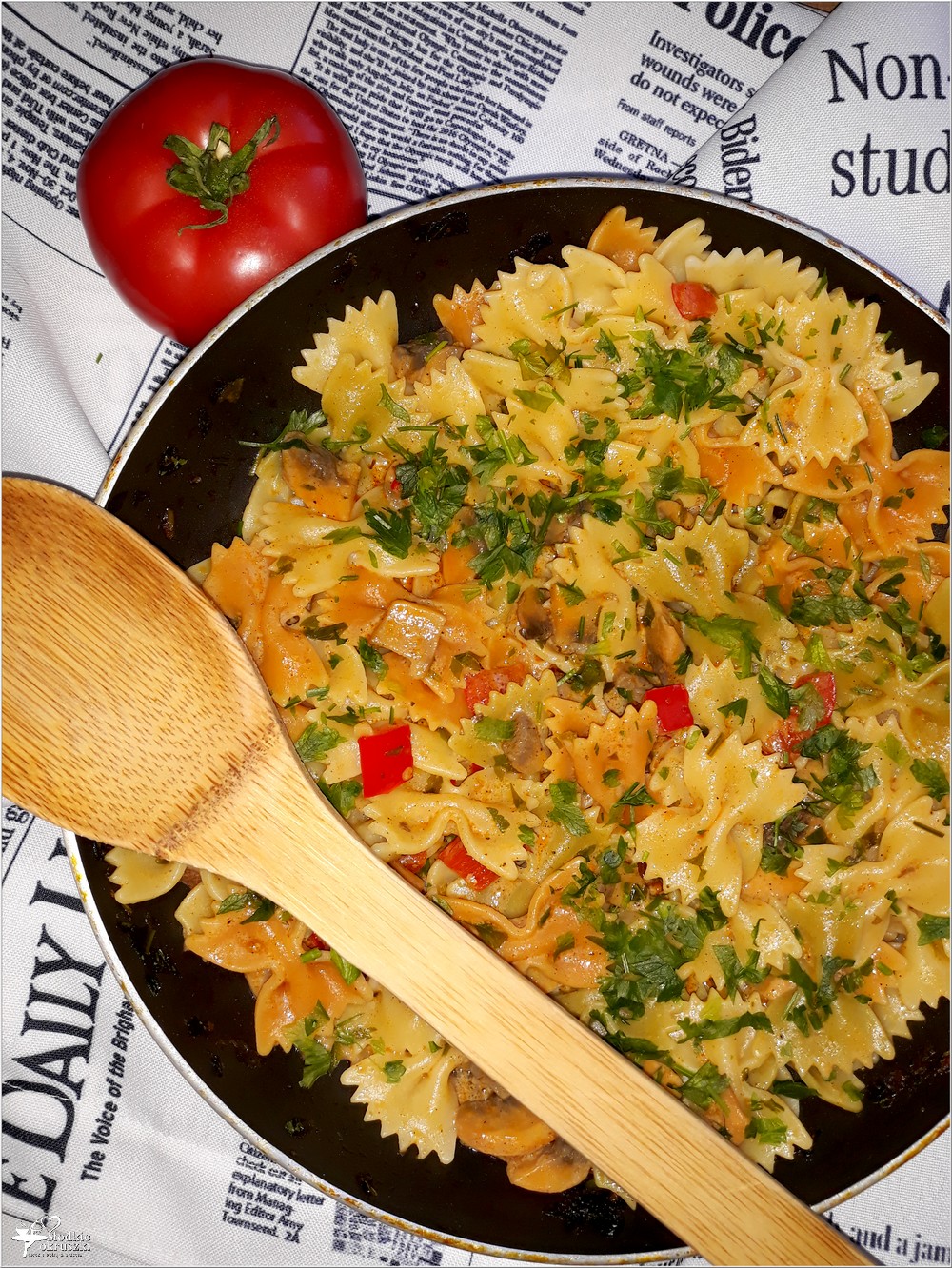 Makaron kokardki w lekkim sosie paprykowo-pieczarkowym