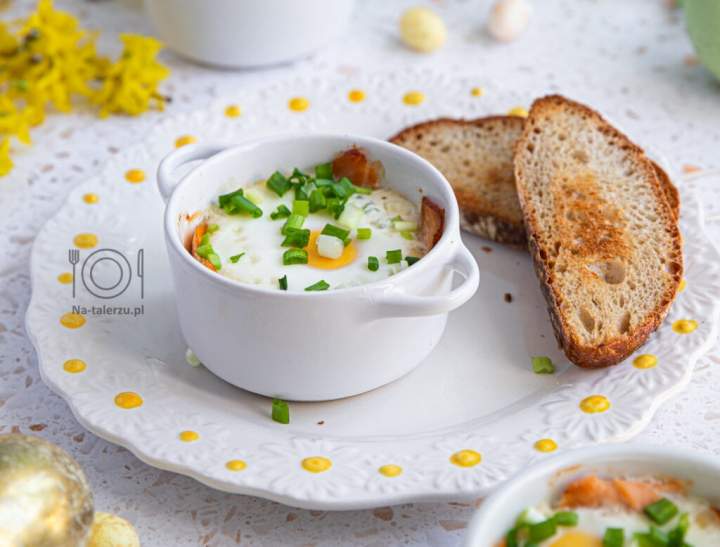Kremowe jajka zapiekane w kokilkach z łososiem wędzonym