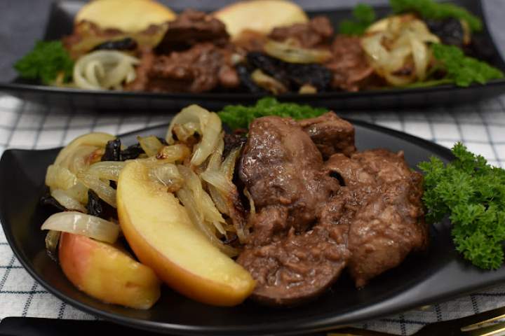 Wątróbka drobiowa z cebulką i śliwkami