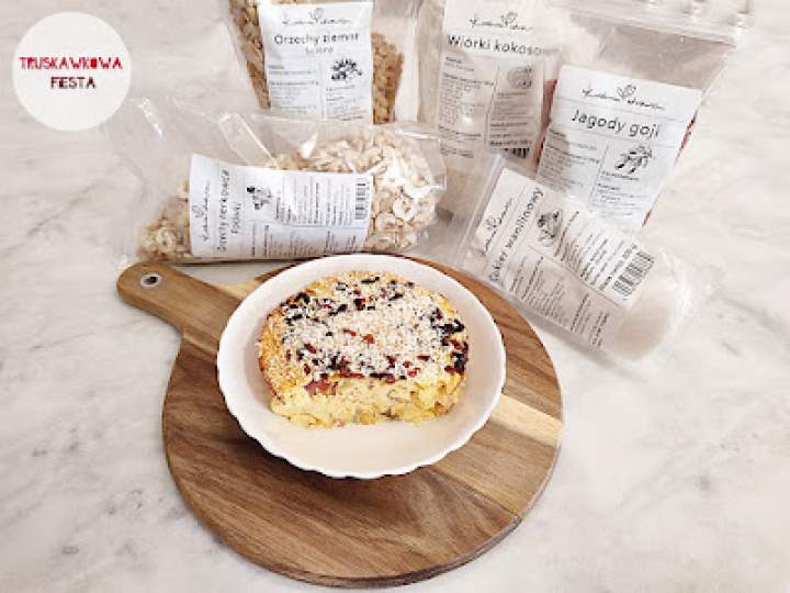 2 jaja20 g cukru wanilinowego250 g twarogu półtłustego40 g skrobi ziemniaczanej100 g gruszki50 g śliwki bez pestki10 g orzechów ziemnych10 g orzechów nerkowca10 g wiórków kokosowych10 g jagód gojiaromat
