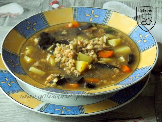rosół ok 2 l3 ziemniakimarchewkacebulapół szklanki pęczakusólpieprzziołagarść suszonych grzybówGrzybki wcześniej moczymy i…