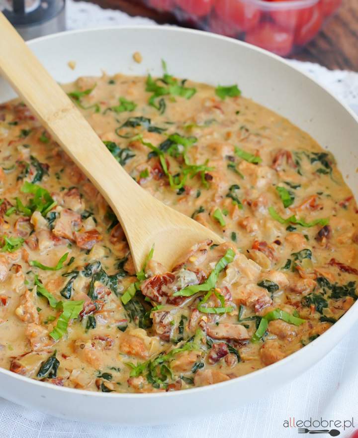 Filet z kurczaka w kremowym sosie z boczkiem i szpinakiem to pyszne danie, które zachwyca połączeniem prostoty i wyrazistego smaku.
