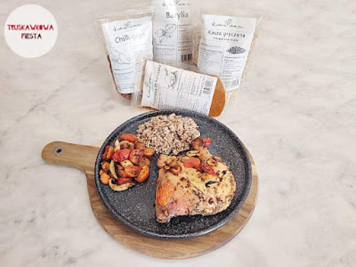 Pieczona ćwiartka kurczaka z kaszą gryczaną białą niepaloną, marchewką, cebulą i pomidorkami