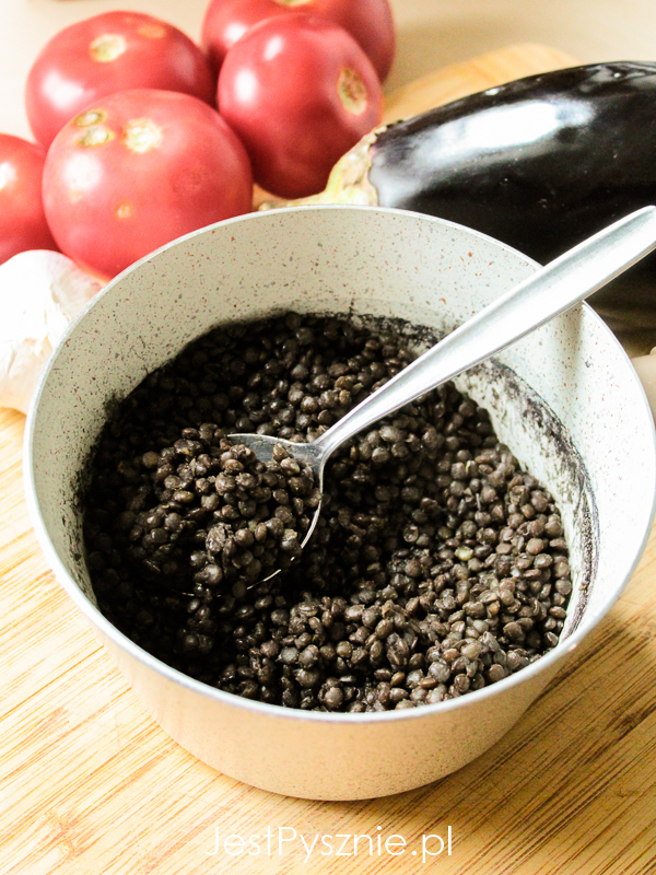 Lśniące, ciemnofioletowe, niemal czarne bakłażany i czarna soczewica beluga z sosem ze…