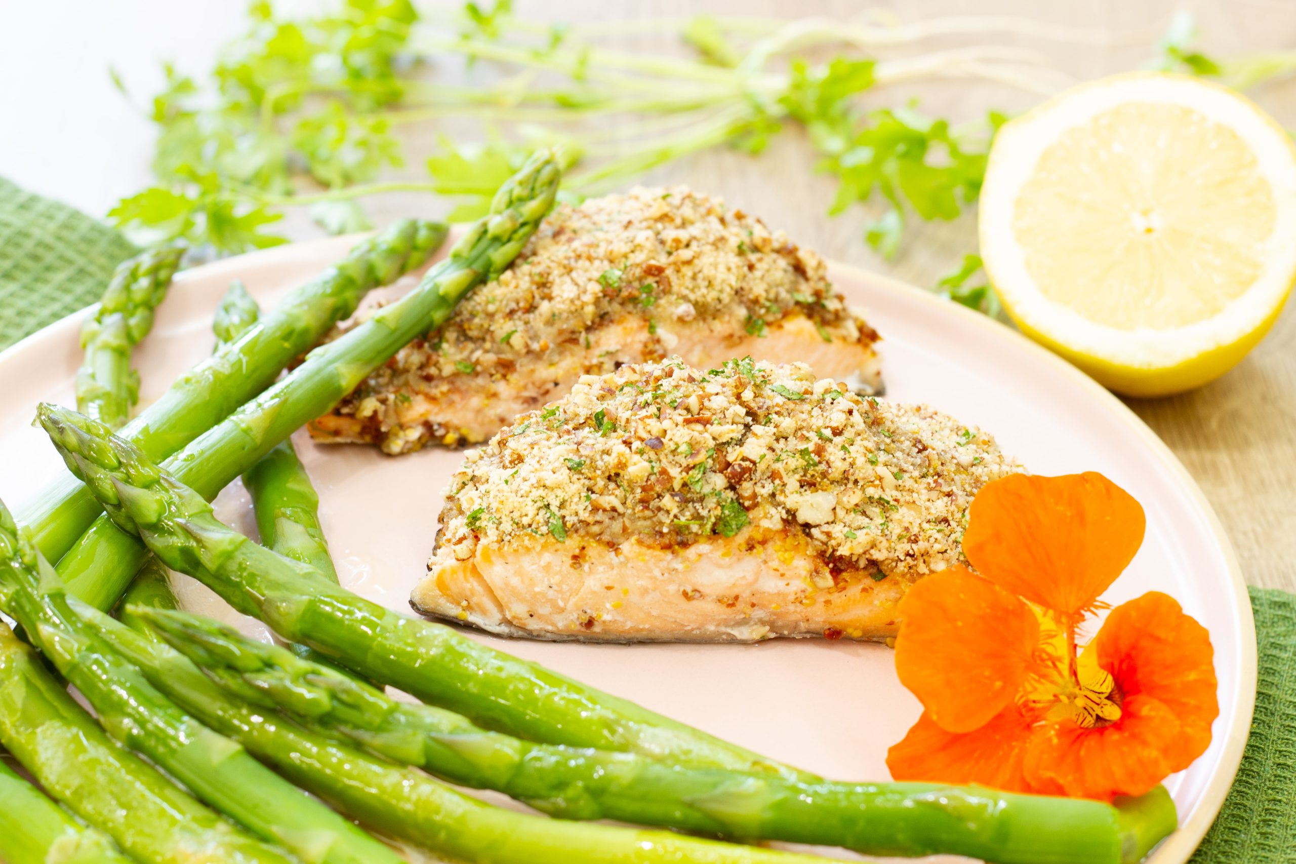 Łosoś z piekarnika z orzechową kruszonką na bazie orzechów pekan, bułki tartej…