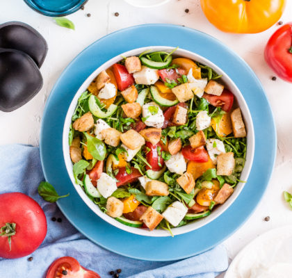 Panzanella, czyli sałatka z pomidorami, grzankami i mozzarellą