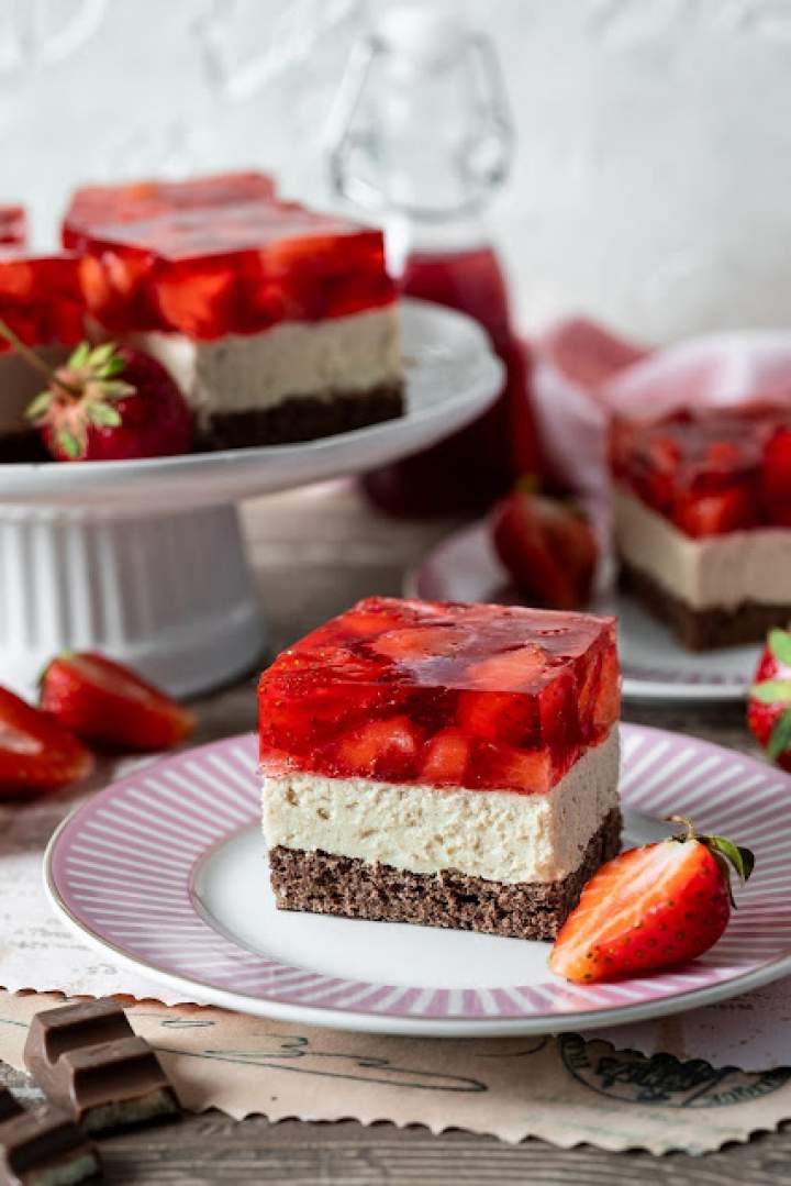 Wspaniałe kremowe ciasto z królującymi już wszędzie soczystymi truskawkami 🙂 To kakaowy biszkopt, krem budyniowy i warstwa truskawek zatopionych w galaretce. Taki w zasadzie klasyk, choć z fajnym twistem, ponieważ krem budyniowy jest z dodatkiem batoników Kinder (tak uwielbianych przez dzieci, chociaż przyznam, że sama bardzo je lubię).