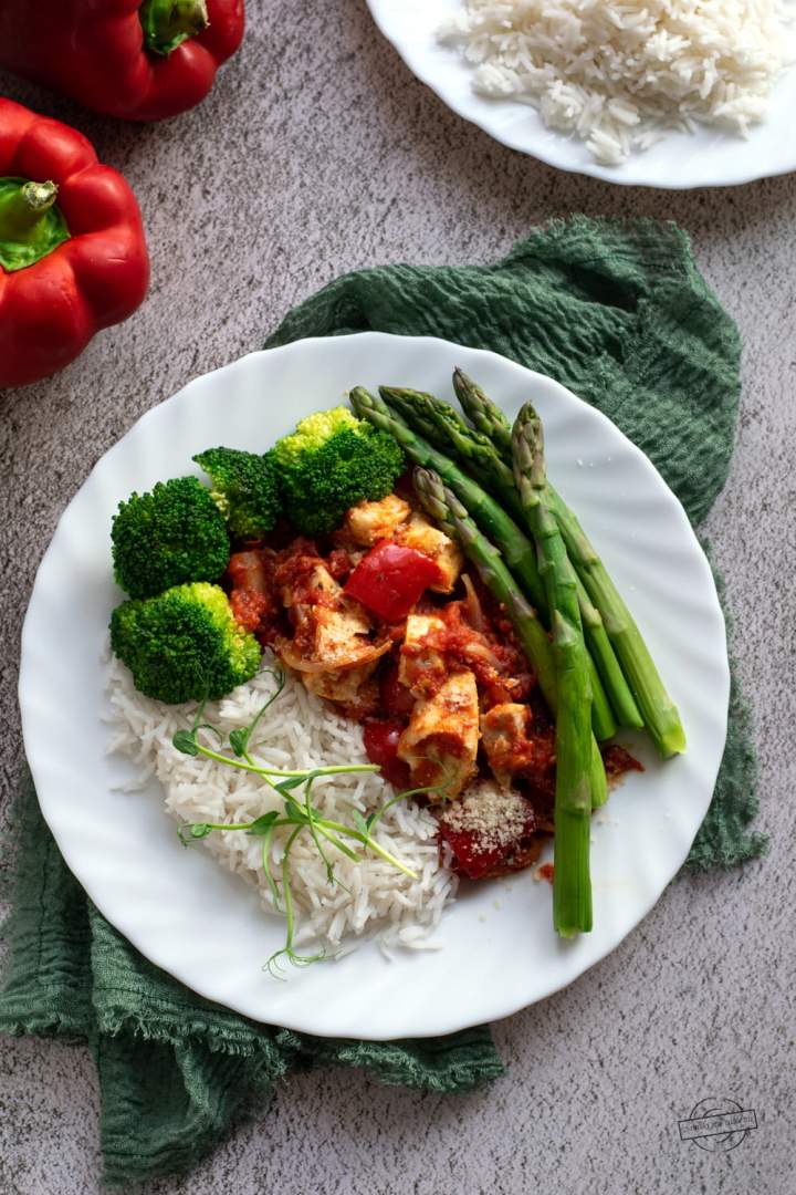 Dorsz z warzywami w sosie pomidorowym, to taka potrawka rybna – delikatna, aromatyczna, idealna by podać ją z dodatkiem ryżu. U mnie w towarzystwie brokułów i szparagów, ale równie dobrze sprawdzi