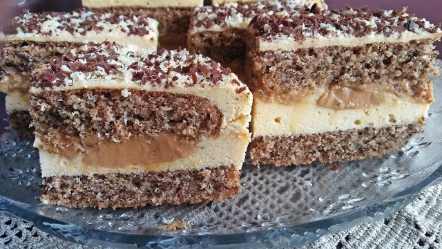 Ciasto orzechowe przełożone kremem ajerkoniakowym i pyszną masą krówkową nie jest zbyt…