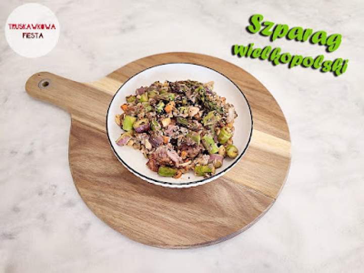 Nerki wieprzowe z zielonymi i fioletowymi szparagami, marchewką, pietruszką i cebulą białą smażone w air fray'erze