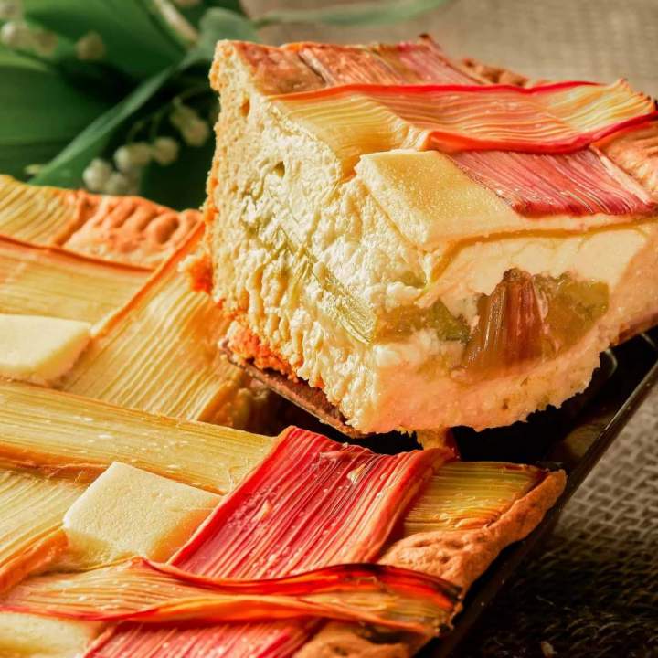 Sernik z rabarbarem w kratkę to połączenie tradycyjnego wypieku z efektownym, sezonowym akcentem. Delikatna masa serowa oparta na mielonym twarogu wzbogacona jest kawałkami kwaskowatego rabarbaru, który wnosi odrobinę świeżości i przełamuje słodycz. Całość oparta jest na klasycznym kruchym spodzie, który nadaje wypiekowi stabilności i lekko maślanego posmaku. Dekoracyjna kratka z cienkich pasów rabarbaru przyciąga uwagę – nie tylko pięknie wygląda, ale i tworzy intrygującą teksturę na górze ciasta.