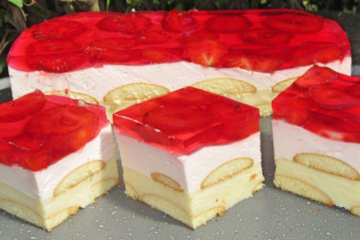 Warstwy biszkoptów przełożone budyniem i pianką truskawkową. Ciasto wieńczy warstwa truskawek zatopionych w galaretce. Ciasto jest przepyszne, kremowe, pięknie wygląda, zapraszam