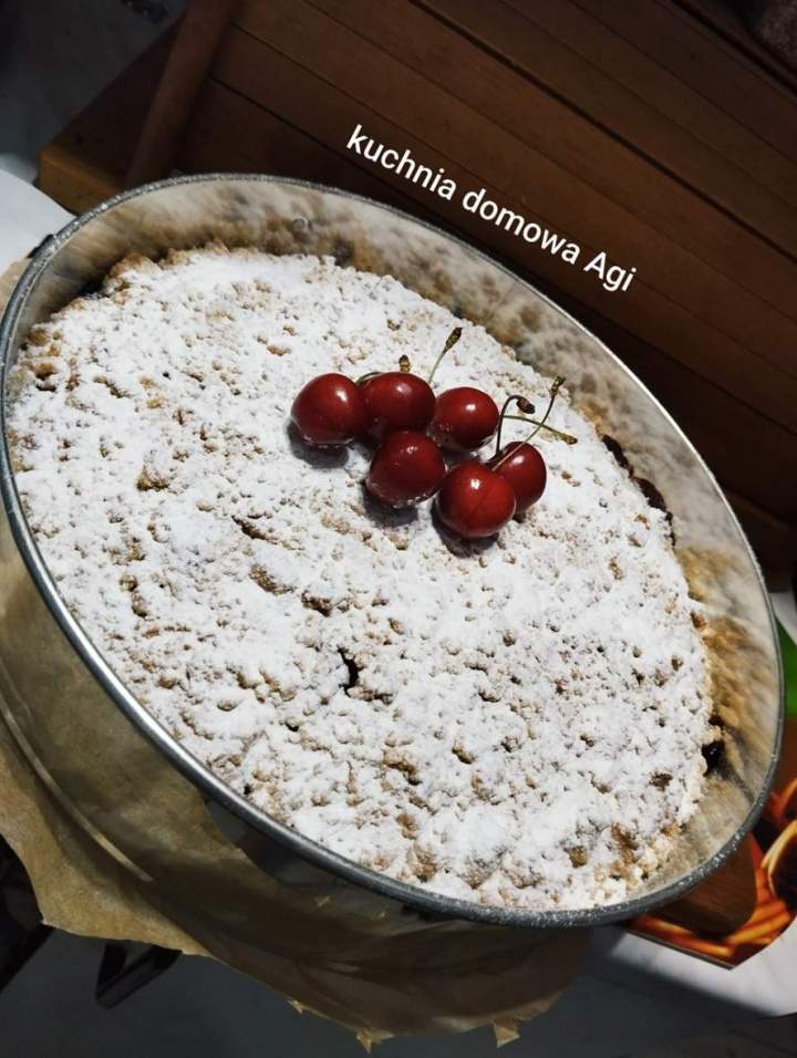 Ciasto drożdżowe łyżką mieszane z czereśniami i kruszonką