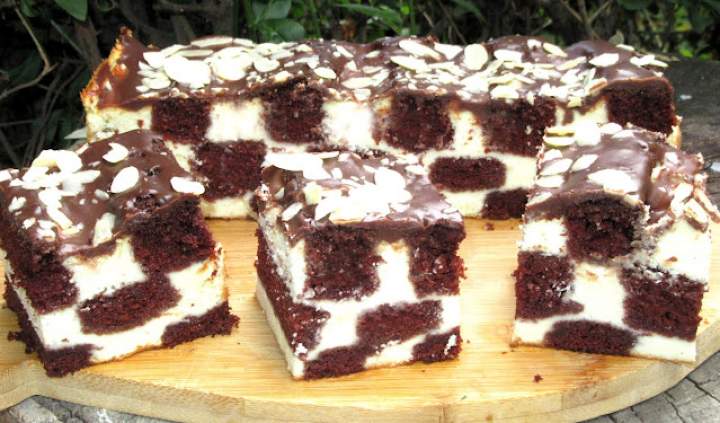 Cześć Kochani, dziś zapraszam Was na rewelacyjny sernik, który nie dość, ze zachwyca smakiem, to pięknie wygląda. Robi wrażenie, ponieważ w przekroju wygląda jak szachownica. Mięciuteńkie ciasto kakaowe przeplata się z delikatną masa serową tworząc kompozycje idealną. Sernik polany jest polewą czekoladową i posypany płatkami migdałowymi.