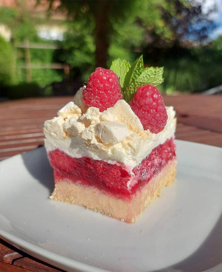 Malinowa chmurka bez pieczenia to deser, który zachwyca lekkością i elegancją, a przy tym nie wymaga nawet włączania piekarnika. Kruche herbatniki i maślany spód stanowią solidną podstawę dla puszystego kremu mascarpone, soczystych malin zatopionych w galaretce i chrupiącej bezy.