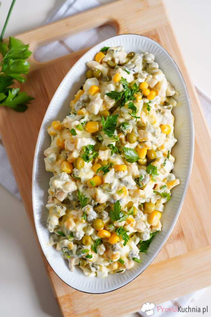 Klasyczna i szybka sałatka jajeczna z groszkiem, kukurydzą, ogórkami konserwowymi i marynowanymi pieczarkami. Sprawdzony przepis na pyszną sałatkę, idealną na każdą okazję – szybka, prosta i pełna smaku!