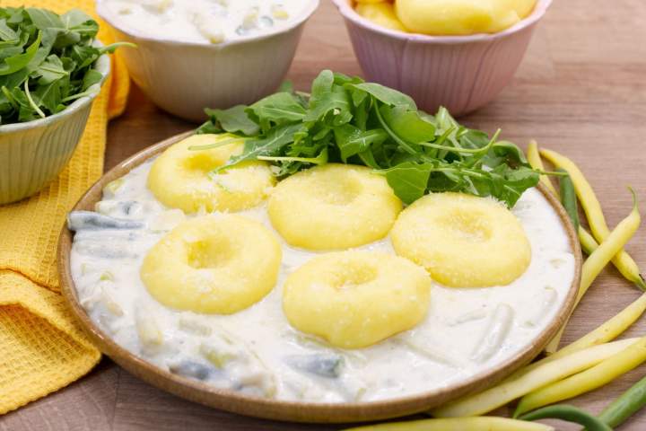 Fasolka szparagowa w sosie serowym z kluskami śląskimi