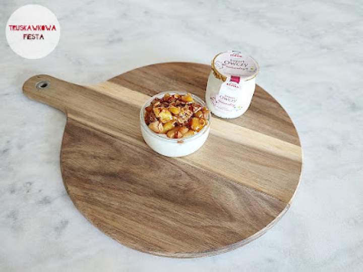 Prażona gruszka, morela, brzoskwinia z płatkami owsianymi i jogurtem owczym