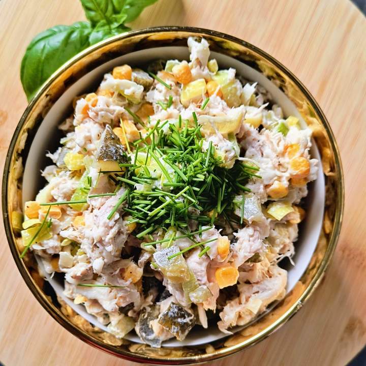 Ta sałatka to świetny pomysł na wykorzystanie kurczaka po ugotowaniu rosołu.