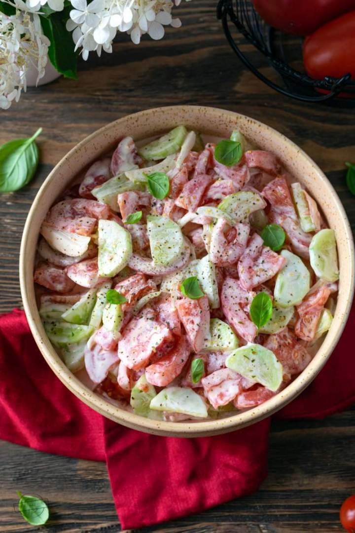 Pomidory, ogórek, cebula oraz śmietanowo-majonezowy sos z czosnkiem i świeżą bazylią. Jest prosto, szybko, klasycznie i przepysznie! U nas często pojawia się jako dodatek do obiadu, szczególnie do kotletów, pieczonego mięsa albo ziemniaczków z