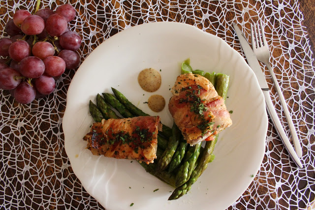 Pierś z kurczaka z salsą pomidorową w boczku ze szparagami w sosie musztardowym.