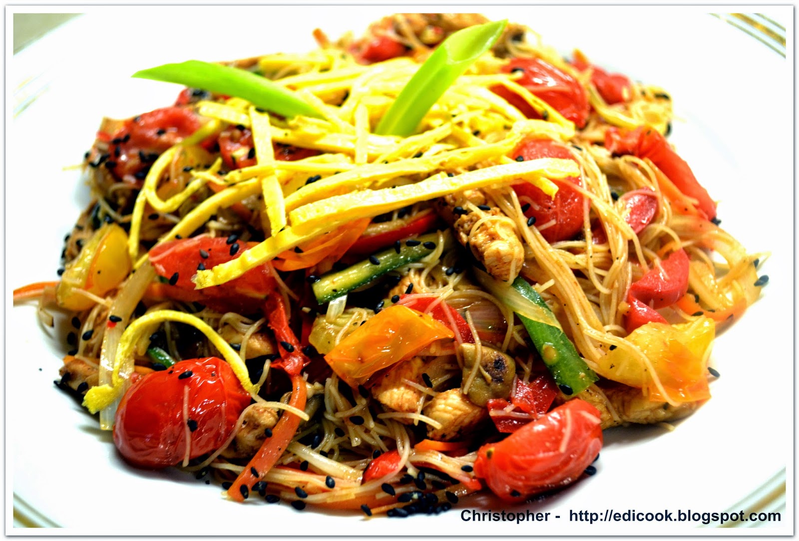 Stir-fried noodles with chicken and vegetables Składniki:10 dag makaron ryżowy nitki1 pierś…