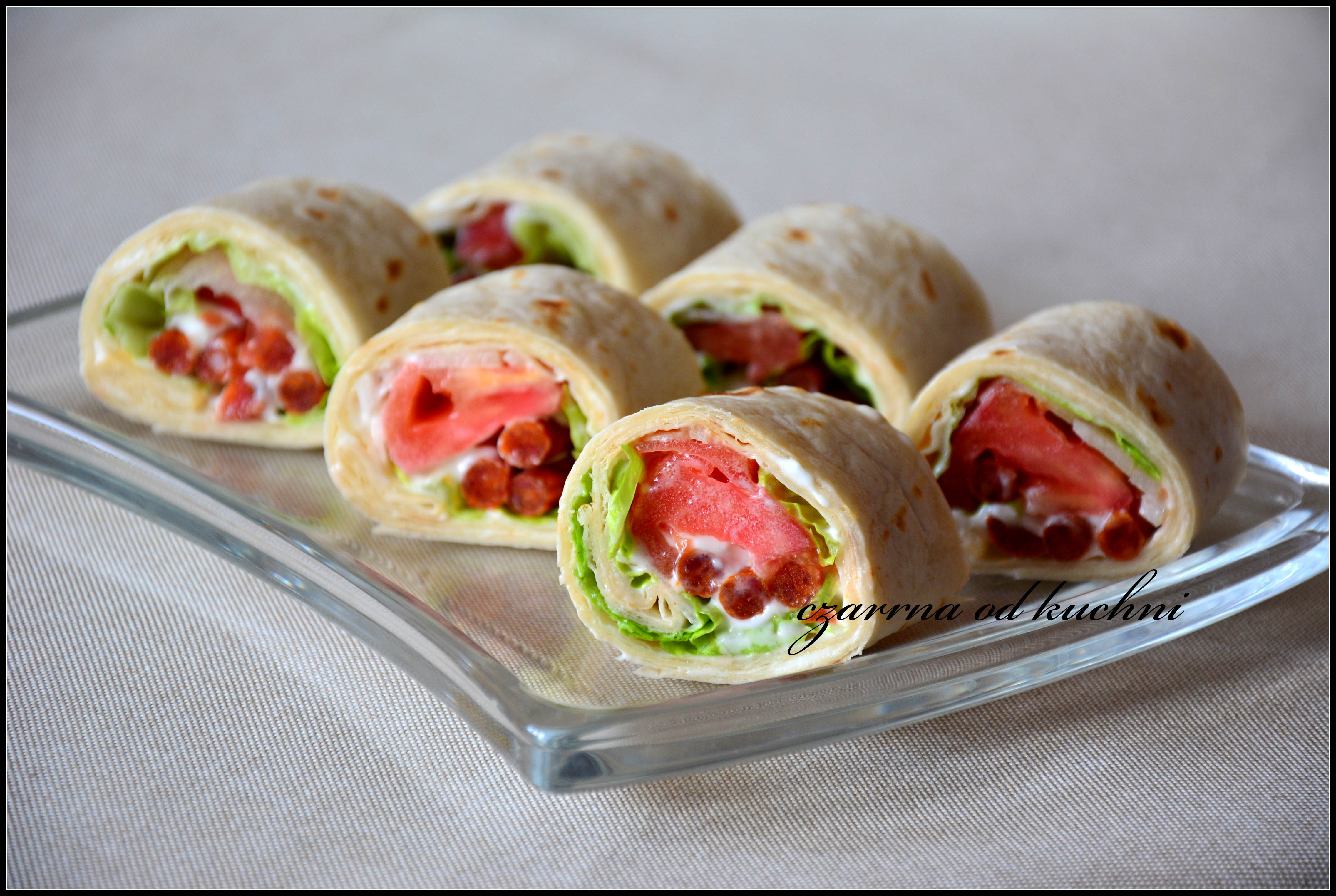 Składniki: 1 tortilla 30 cm Fanex kilka cienkich kabanosów 1 pomidor kilka…