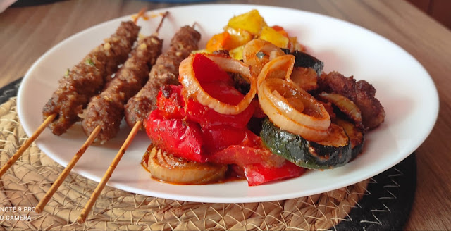 Grilowana kefta z warzywami Grilowana kefta podawana w postaci szaszłyka w Maroku…