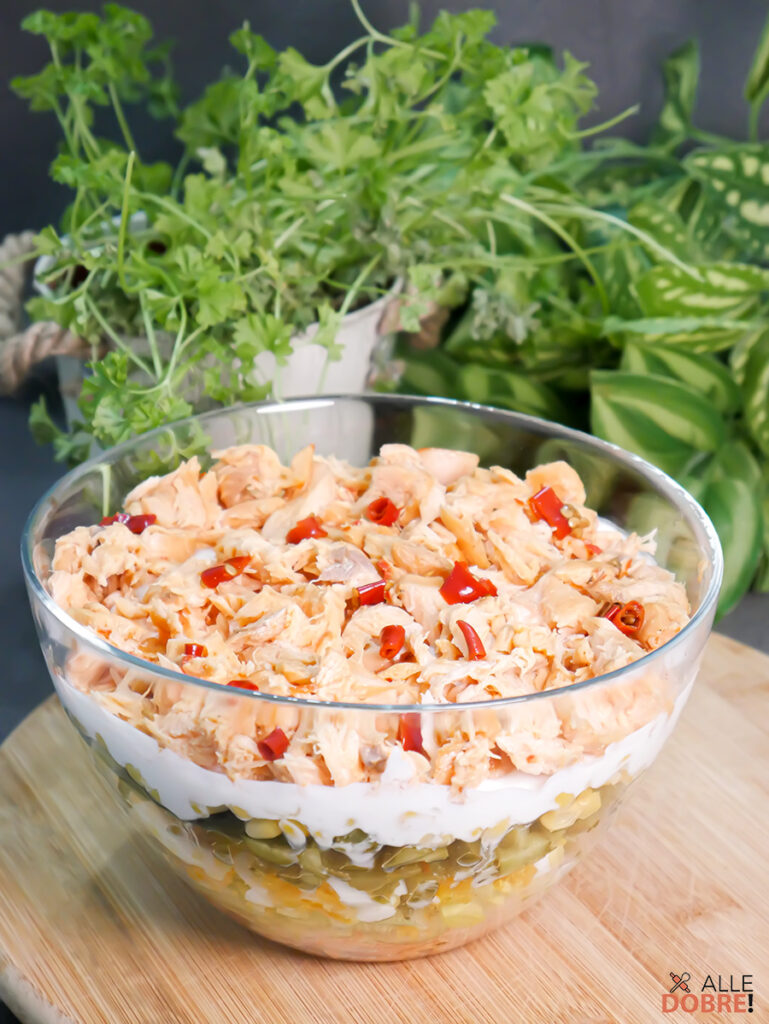 Kolorowa, sycąca i pełna charakteru – taka właśnie jest ta sałatka makaronowa. Delikatna szynka łączy się tu ze słodyczą kukurydzy, wyrazistą czerwoną cebulą oraz dwoma odsłonami pomidorów: soczystymi, świeżymi i aromatycznymi, suszonymi w oliwie. Całość spaja kremowy dressing musztardowy na bazie Dijon i francuskiej ziarnistej, który dodaje lekko
