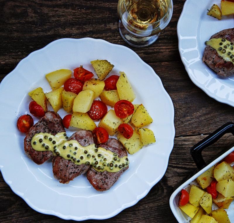 Kotleciki z polędwiczki wieprzowej w sosie pieprzowym. Podawane z zapiekanymi ziemniaczkami i…