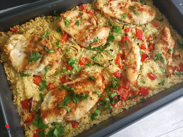 KUS KUS Z PAPRYKĄ, CEBULĄ I PIERSIĄ KURCZAKA ZAPIEKANY W PIEKARNIKU