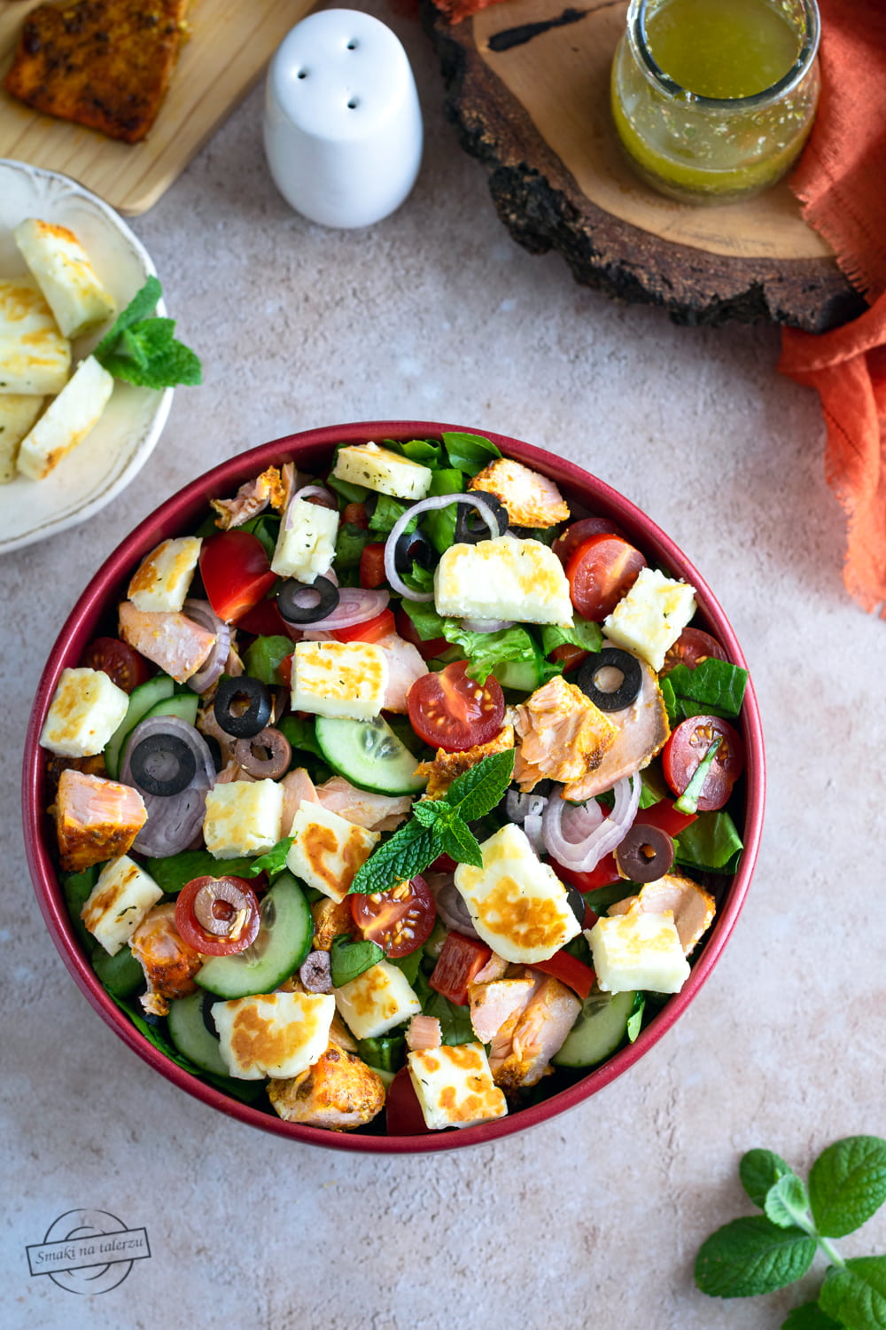 Sałatka w greckim stylu, z sałatą rzymską, pomidorkami, papryką, ogórkiem i oliwkami,…