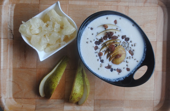 866. Kokosowy krem z gruszką, rodzynkami i konopią