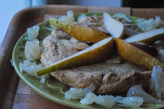 550. Omlet gryczany z gruszką, serkiem karobowym, brazylami i melasą
