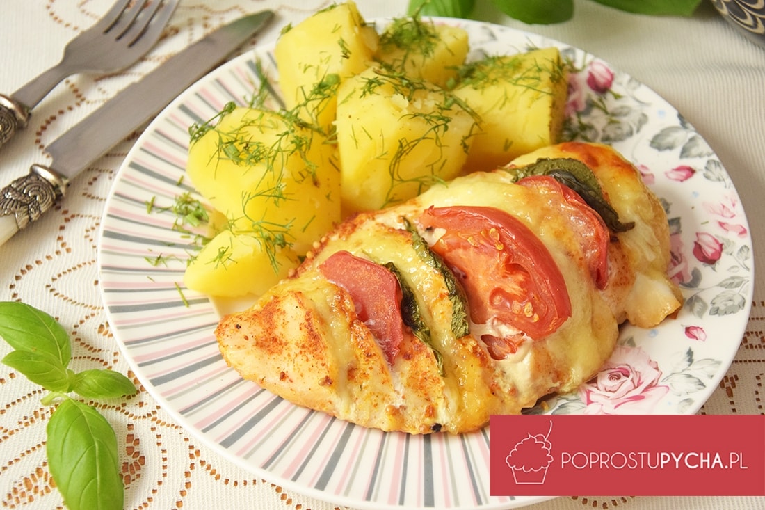Zapiekany kurczak nadziewany mozzarellą, pomidorami i bazylią