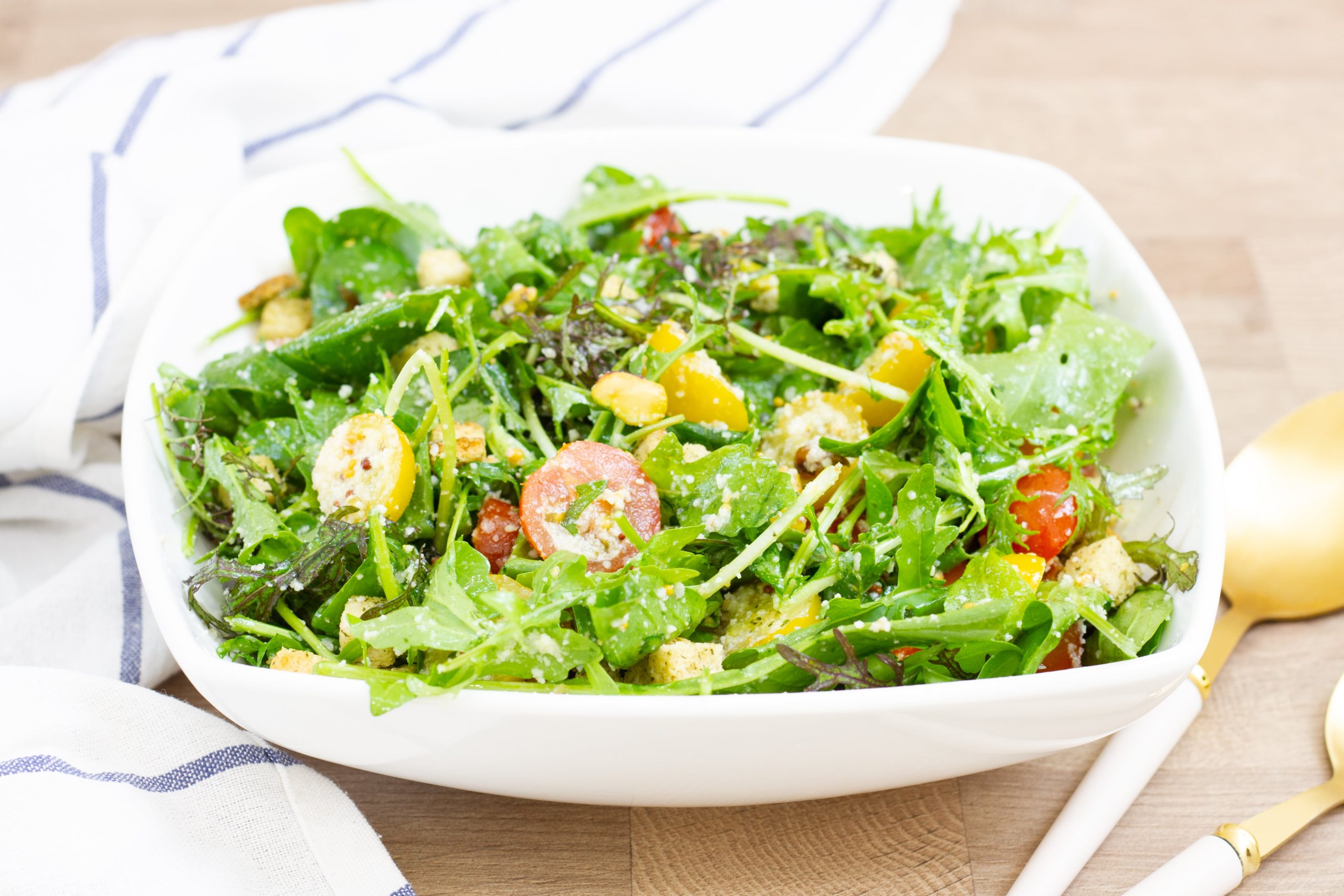 Lekka, świeża sałatka z grzankami, pomidorkami koktajlowymi, parmezanem i pistacjami. Sałatka skropiona…