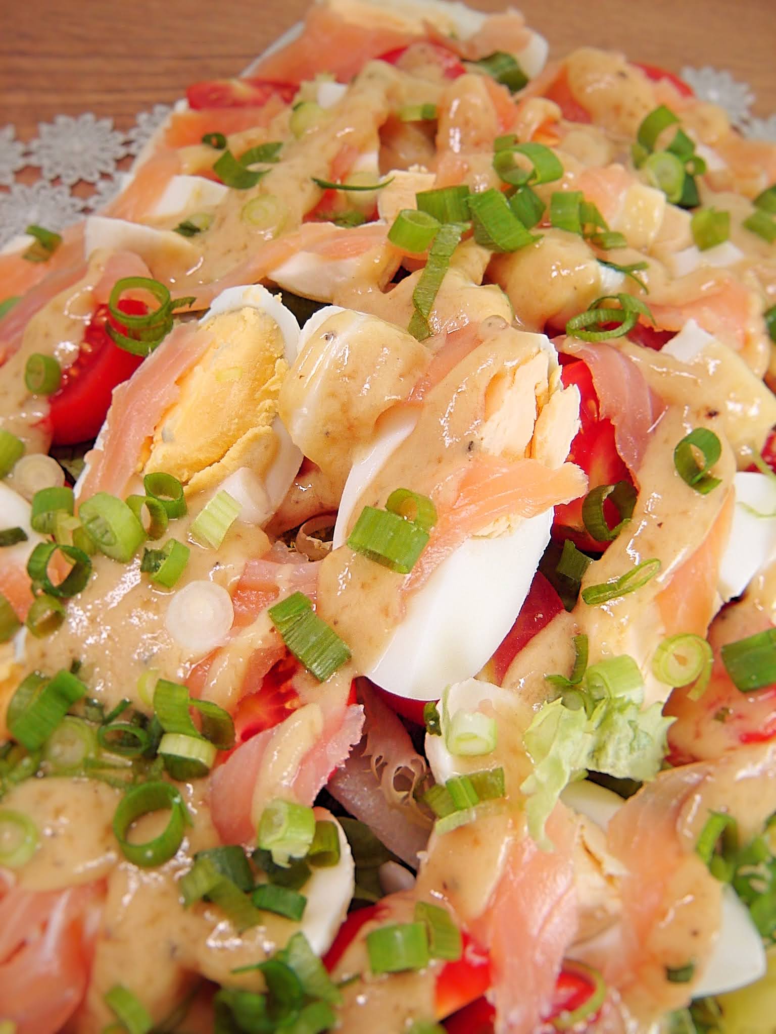 Przepyszna, lekka, ekspresowa w przygotowaniu sałatka z łososiem wędzonym, jajkiem, mozzarellą, pomidorkami…