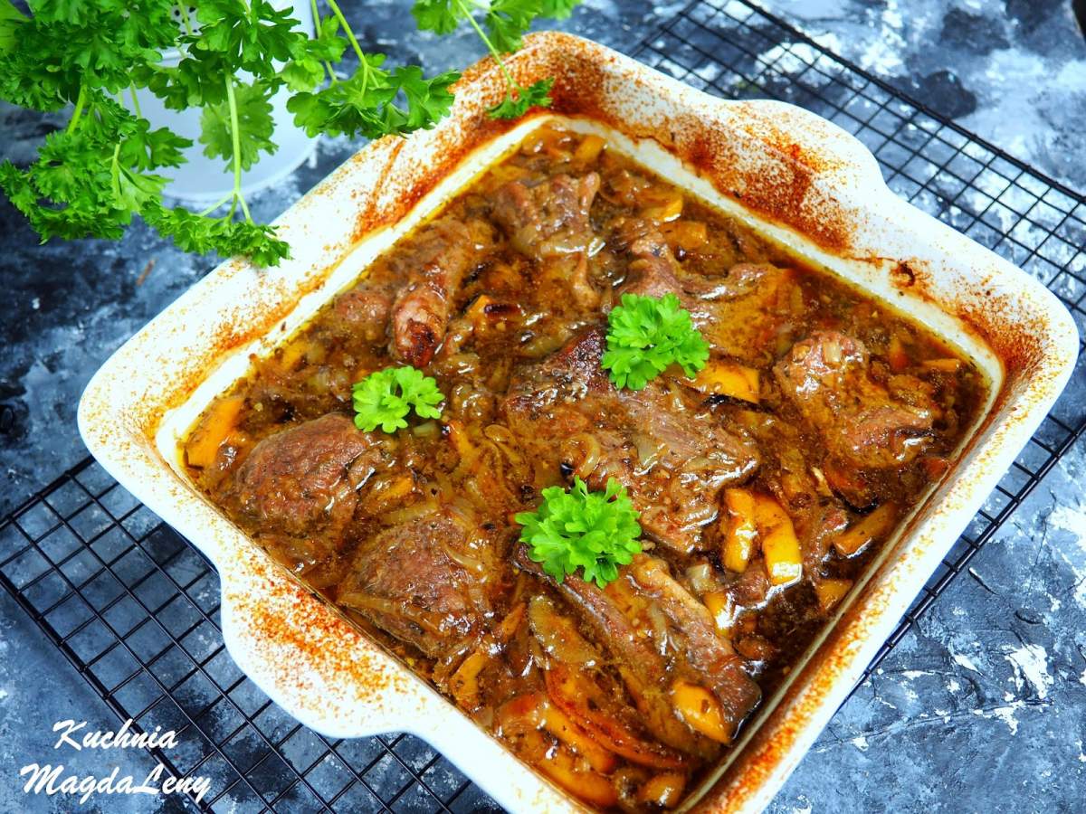 Plastry karkówki wieprzowej w ciemnym sosie piwnym z cebulą oraz papryką, pieczone…