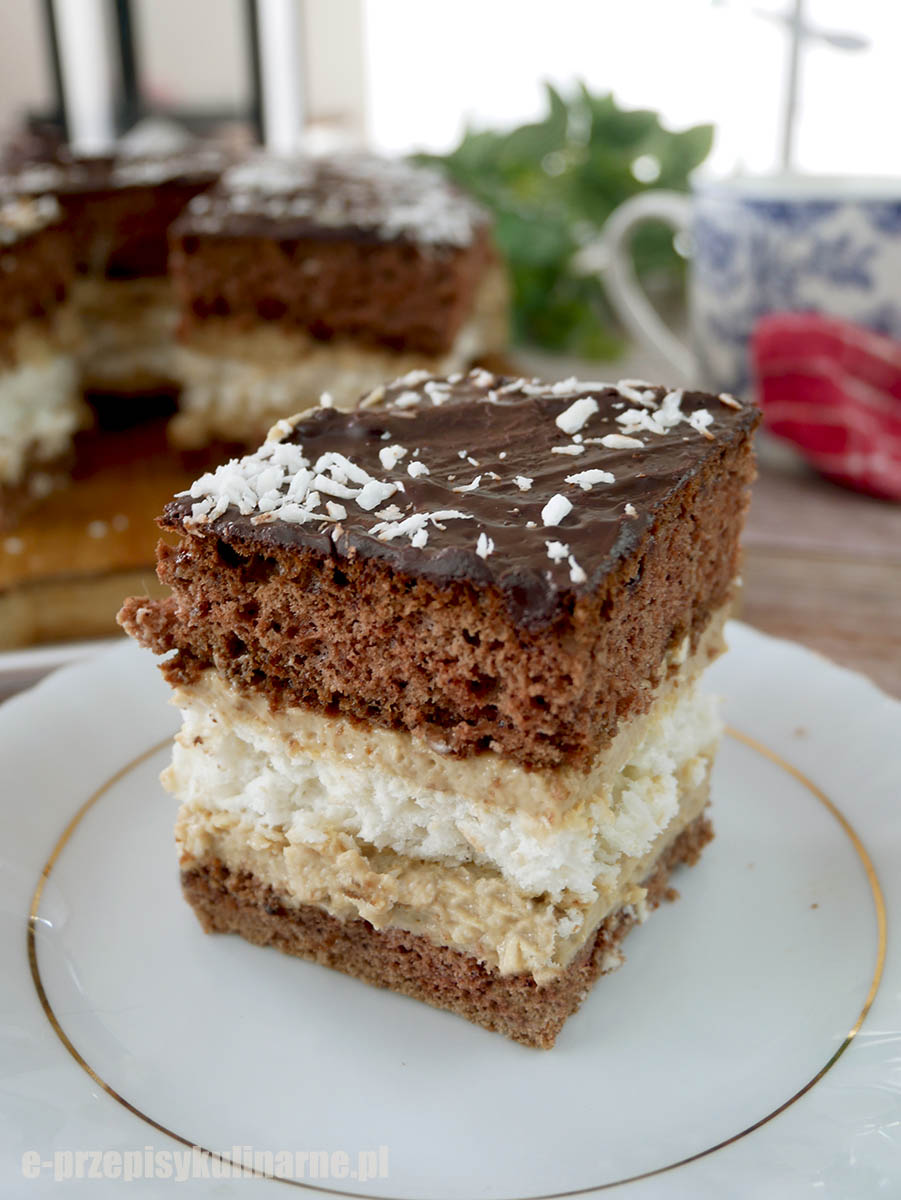 Kawowy Przekładaniec to klasyczne, warstwowe ciasto, które wielu osobom kojarzy się z dawnymi cukierniami i domowymi wypiekami z zeszytu w kratkę. Połączenie kakaowego biszkoptu, delikatnego biszkoptu kokosowego oraz kawowego kremu budyniowego daje bardzo smaczny, wyważony deser, który świetnie sprawdzi się na niedzielę, rodzinne spotkania czy święta. To ciasto nie jest