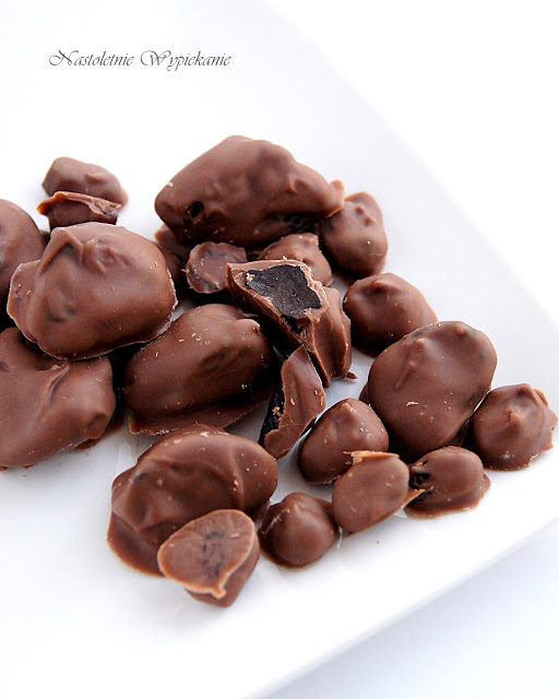 Suszone owoce zatopione w czekoladzie- u mnie śliwki, żurawina i rodzynki. Oczywiście…