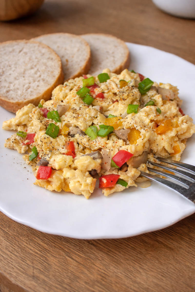 Jajka wbij do miseczki, delikatnie roztrzep widelcem i dopraw solą oraz pieprzem. Wlej je na patelnię z warzywami i smaż na małym ogniu, mieszając powoli, aż jajecznica osiągnie konsystencję, jaką lubisz najbardziej. Warto zdjąć ją z ognia chwilę wcześniej, ponieważ jeszcze przez moment będzie dochodzić na patelni.