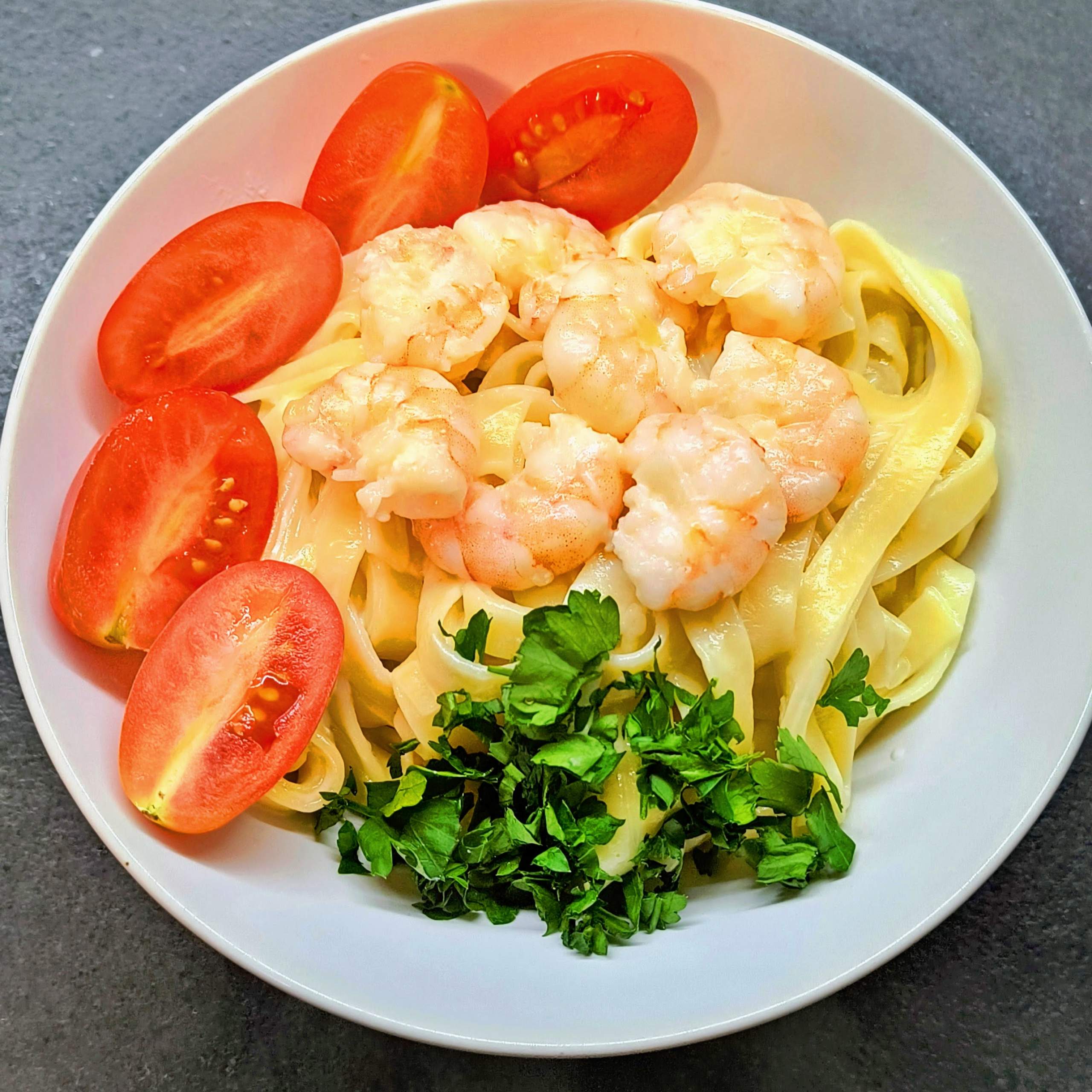 Krewetki smażone z dodatkiem czosnku i cebuli ze śmietaną. Podane z makaronem, małymi pomidorami oraz natką pietruszki