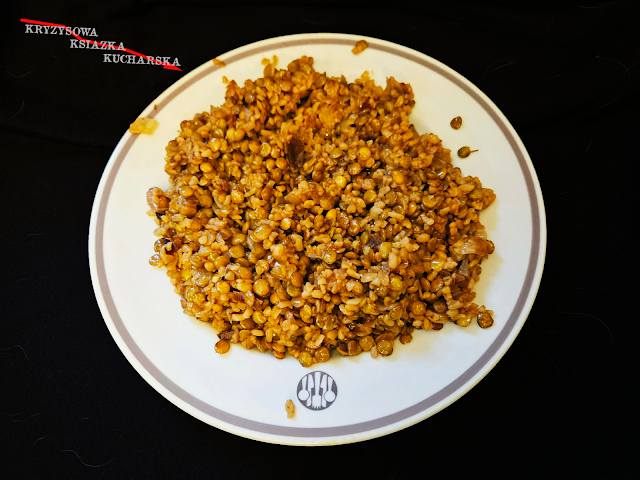 Cebulę kroimy w drobną kostkę i podsmażamy aż będzie brązowa, ale nie spalona.Dodajemy trochę kaszy i soczewicy. Podlewamy wodą i dolewamy w miarę możliwości, podczas gdy będzie wchłaniana.