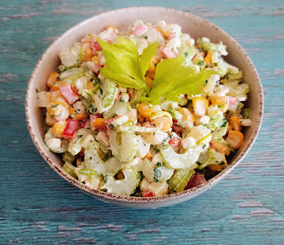 Seler naciowy oraz por kroimy w cienkie plasterki, paprykę jabłka oraz ananas w drobną kostkę dodajemy do jednej miski. Do całości dodajemy odcedzoną z zalewy kukurydzę.