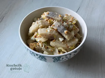 Sałatka śledziowa z ziemniakami zazwyczaj zawiera majonez, u mnie jest w wersji nieco zdrowszej z musztardą.