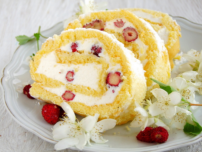 rolada z bitą śmietaną i z poziomkami