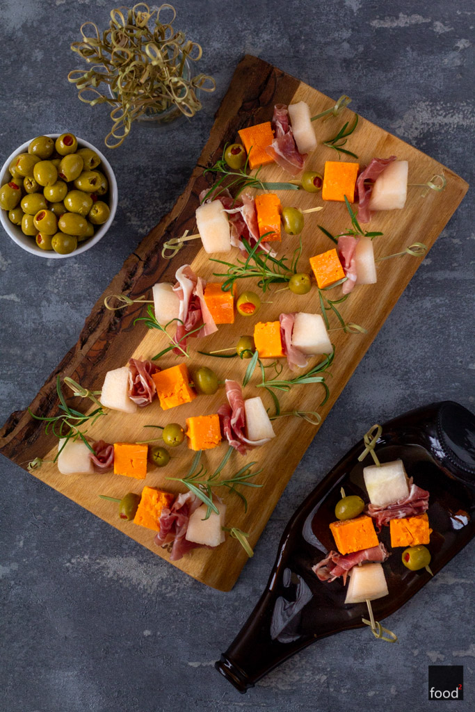 Koreczki z melonem, prosciutto, serem i oliwkami