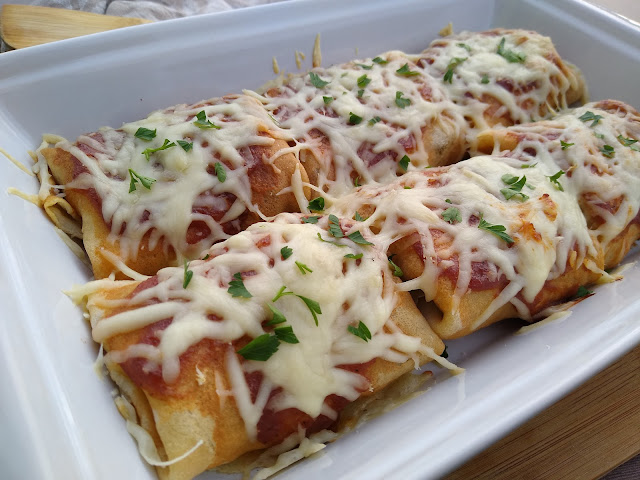 Danie z cyklu czyszczenie lodówki. Do wykorzystania miałam pieczarki, cienką kiełbasę, resztki żółtego sera i mozzarellę. Zawsze były zapiekanki albo pizza a tym razem padło na naleśniki. Kiełbasę i pieczarki podsmażyłam, usmażyłam naleśniki, nadziałam, zapiekłam pod keczupem i serem. Proste, smaczne i nic się nie zmarnowało.