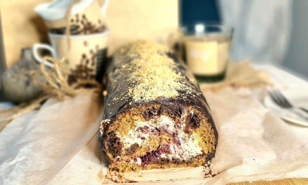 Rolada marchewkowa z kremem straciatella i dżemem wiśniowym. I wiecie, co Ci powiem? To jest przepyszne ciacho, które nie wymaga za wiele pracy i czasu. No i ta czekolada u góry!! Lepiej od razu zabierz się za pieczenie 😉
