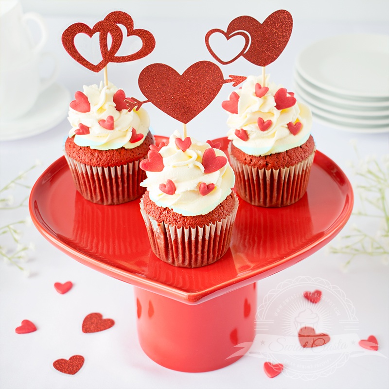 Małe serduszka z czerwonej masy cukrowej dodają muffinkom walentynkowego charakteru i sprawiają, że każda babeczka